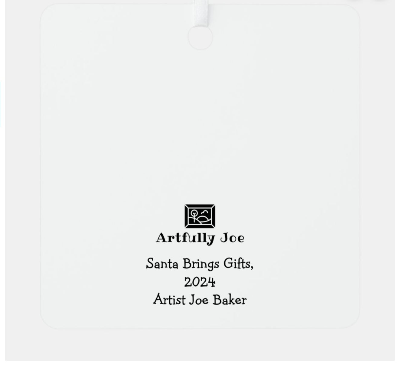 It is a metal but lightweight square tree ornament with a white ribbon hanger. Joe’s new Santa Brings Gifts piece is displayed on the ornament.