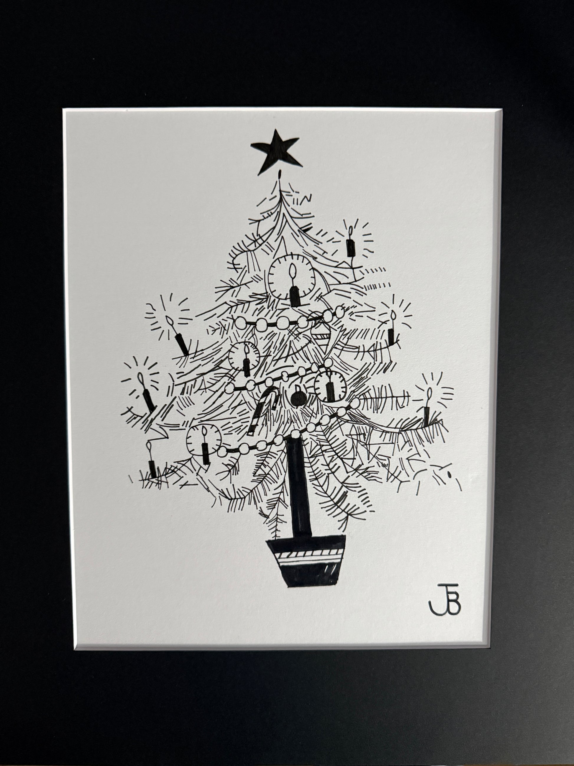 Black and white Tree, ink on cardstock, matted to 11x14 in black, and ready to frame.