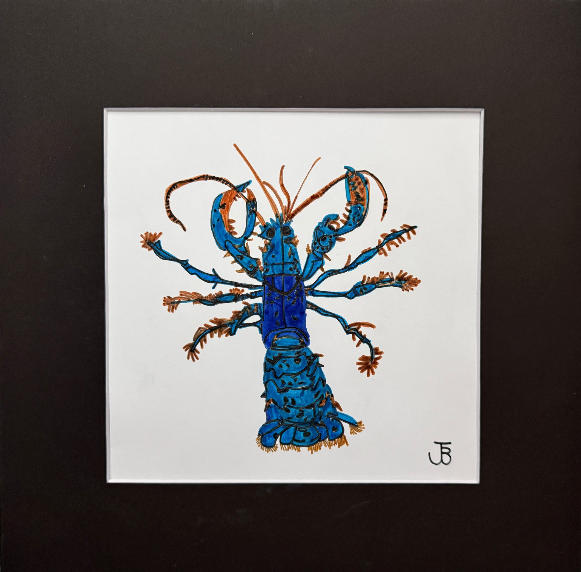 Blue Lobster, ink on cardstock, matted to 12x12 square and ready to frame!