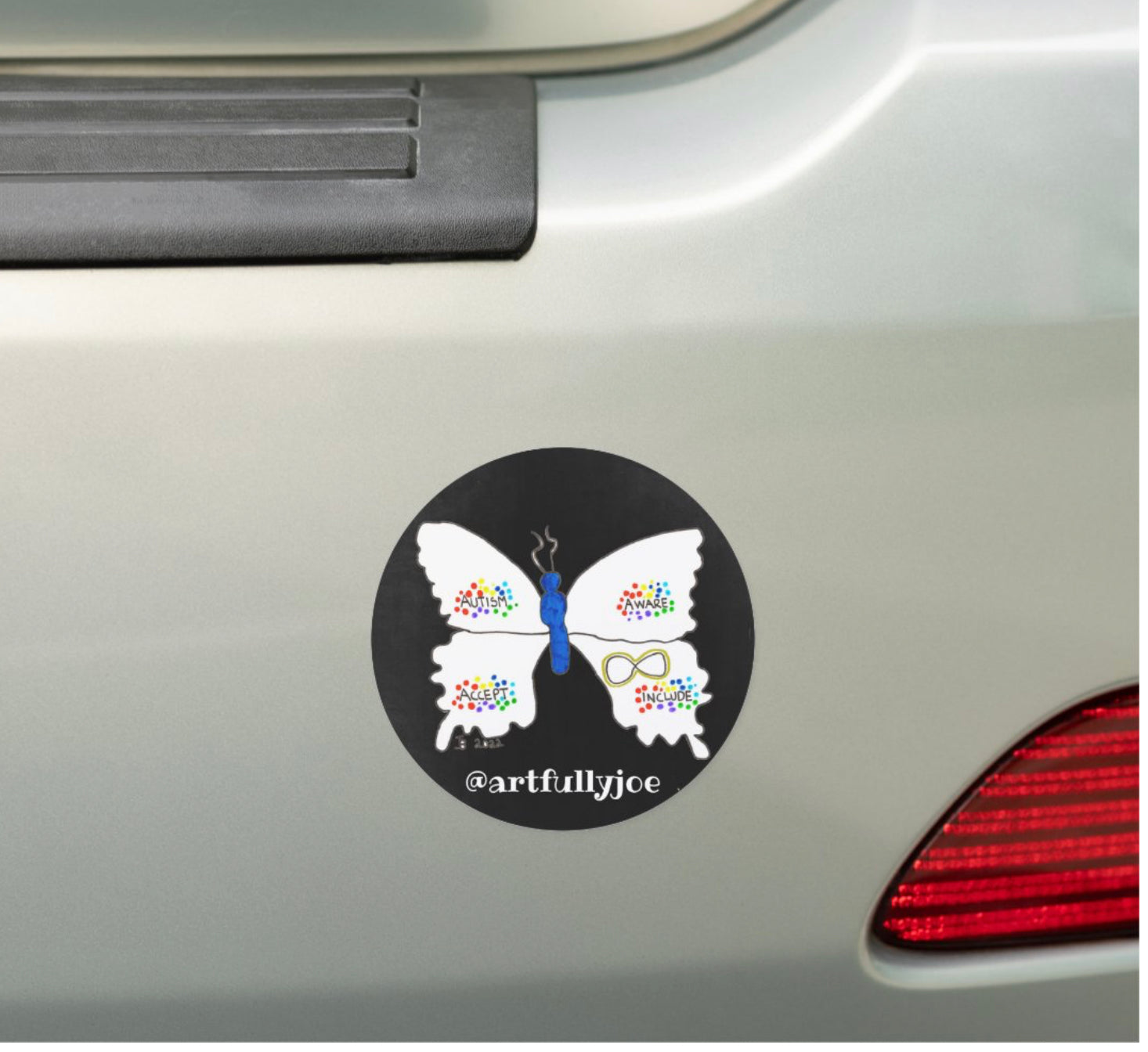 Joe’s butterfly design on a weather friendly magnet- In honor of April being Autism Awareness and Acceptance Month. Perfect for your car or anything magnetic.